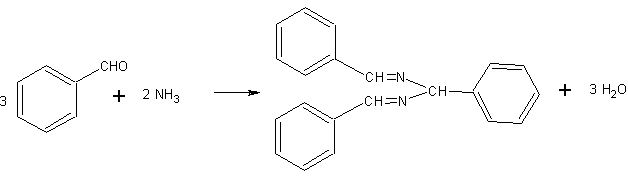 В круглодонную колбу емкостью 150 мл, снабженную мешалкой с глицериновым затвором, загружают 63,6 г (0,6 моль) бензальдегида и 40 мл водного аммиака. Реакционную смесь перемешивают при комнатной температуре в течение 6 часов затем оставляют без перемешивания еще на 18 часов. При этом выпадает осадок, его отфильтровывают и промывают водой до исчезновения в промывных водах щелочной реакции по универсальной индикаторной бумажке. Сушат при 100 С. Получают 54,7 г гидробензамида (91,7% теории), т. пл. 101—102 С.