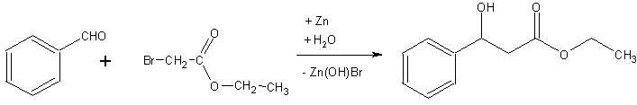 В чистую сухую пол-литровую трехгорлую колбу, снабженную механической мешалкой, делительной воронкой на 250 мл и обратным холодильником с хлоркальциевой трубкой, помещают 40 г (0,62 моля) очищенной цинковой пыли или гранулированного цинка. В делительную воронку наливают раствор 83,5 г (0,50 моля) бромуксусного эфира и 65 г (0,61 моля) бензальдегида в 80 мл сухого бензола и 20 мл абсолютного эфира. Прибавляют к цинку около 15 мл этого раствора и нагревают колбу до тех пор, пока не начнется реакция. Затем пускают в ход мешалку и начинают прибавлять остальной раствор с такой скоростью, чтобы жидкость слабо кипела. Прибавление всего раствора занимает около часа. Кипячение продолжают еще полчаса, затем колбу охлаждают в ледяной бане и выливают реакционную массу при энергичном перемешивании в 300 мл охлажденной, до 0 С 10%-ной серной кислоты. Водный.слой отбрасывают, а бензольный раствор экстрагируют 5%-ной серной кислотой (два раза по 50 мл), охлажденной до 0 С, а затем промывают один раз 25 мл охлажденного 10%-ного раствора соды, один раз 25 мл охлажденной 5%-ной серной кислоты и, наконец, водой (два раза по 25 мл). Соединенные кислые вытяжки промывают эфиром (два раза по 50 мл) и смесь эфирного и бензольного растворов сушат 5 г безводного сернокислого магния. После фильтрования растворитель отгоняют на водяной бане, а остаток фракционируют в вакууме. Отбирают фракцию 151-154 С (11-12 мм.рт.ст.) или 128-132 С (5-7 мм.рт.ст.).