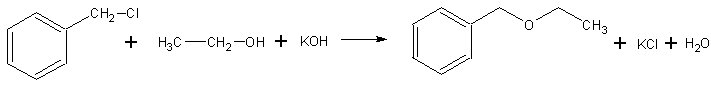 В круглодонную колбу емкостью 200 мл помещают 4 г КОН и 25 мл этилового спирта. Колбу снабжают обратным холодильником и осторожно нагревают смесь до растворения щелочи (небольшое количество КОН может остаться нерастворенным). Раствор охлаждают и прибавляют 5,8 мл хлористого бензила (внимание: хлористый бензил раздражает слизистые оболочки глаз и кожу). Затем осторожно нагревают смесь до начала кипения и отставляют горелку. По окончании бурной стадии реакции (приблизительно через 15 мин) колбу помещают в горячую водяную баню и кипятят еще 20 мин. Реакционную смесь охлаждают в бане с холодной водой, прибавляют 50 мл ледяной воды и встряхивают до полного растворения твердого вещества. Затем прибавляют небольшими порциями 2 н. НСl до кислой реакции водного слоя по лакмусу. Полученный эфир отделяют, промывают водой (2 раза по 5 мл), сушат над плавленым СаСl2 и перегоняют, собирая фракцию с т. кип. 180-187 С.