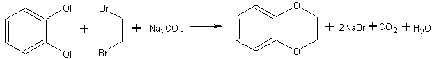 В круглодонную колбу емкостью 250 мл помещают 11 г пирокатехина, 23,5 г 1,2-дибромэтана, 15 г безводной Na2CO3 (или К2СO3) и 10 мл свежеперегнанного в вакууме глицерина. Смесь тщательно перемешивают (при этом образуется паста), присоединяют к колбе обратный холодильник, помещают ее на масляную баню, нагретую до 150-160 C, и выдерживают при этой температуре в течение 6 ч (при перегревах происходит осмоление, и выход бензодиоксана значительно снижается). Затем убирают баню, дают реакционной смеси охладиться до комнатной температуры и при перемешивании добавляют 40 мл воды. Полученный раствор переносят в делительную воронку и экстрагируют (2 раза по 30 мл) бензолом (бензол легко воспламеняется, пары его ядовиты). Экстракт высушивают над прокаленным MgSO4, отгоняют бензол и остаток перегоняют в вакууме.
