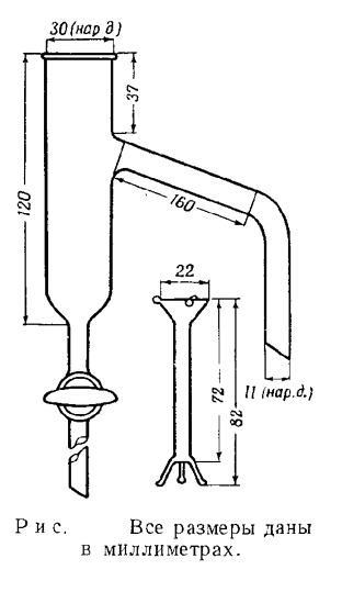 7. Отделитель, показанный на рисунке, является видоизменением этого прибора, применяемого для определения содержания воды по методу Дина и Старка. Размеры отделителя можно изменять в зависимости от индивидуальных целей, поскольку этот вопрос касается главным образом удобства. Отделитель можно применять без внутренней воронки, но при ее наличии (К. Кельш, частное сообщение) конденсат разделяется на два слоя быстро и полностью, причем жидкость, стекающая из холодильника, не вызывает перемешивания обеих фаз в отделителе. Ножка воронки должна быть такой длины, чтобы верхний край воронки находился выше бокового отвода отделителя. Трубку отделителя можно градуировать, однако это не обязательно.