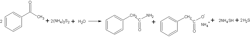 Раствор сернистого аммония получают, пропуская сероводород в концентрированный водный аммиак до насыщения раствора. Смесь 2 г ацетофенона с 10 г бесцветного раствора сернистого аммония и 1 г серы нагревают в запаянной трубке в течение 4 часов при 200-220 С. После того как реакционная смесь охладится, ее обрабатывают достаточным количеством соляной кислоты для полного разложения полисульфида аммония, кипятят с газовой сажей в большом объеме воды для обесцвечивания раствора и коагуляции серы и фильтруют. Прозрачный горячий фильтрат подщелачивают содой и по охлаждении несколько раз обрабатывают эфиром для извлечения фенилацетамида. После этого раствор доводят до сильнокислой реакции и снова тщательно обрабатывают эфиром для извлечения фенилуксусной кислоты.