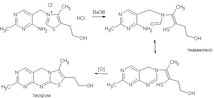 50 мл гиамина хлорида растворяют в 25 мл воды. К 5 мл раствора приливают 1 мл раствора гексацианоферрата (III) калия (или перманганата калия, или перекиси водорода), 1 мл раствора едкого натра, 5 мл бутилового или изоамилового спирта. Хорошо встряхивают и дают отстоятся. В верхнем слое возникает наблюдаемая в УФ-свете синяя флуоресценция, исчезающая при подкислении и вновь возникающая при подщелачивании раствора (флюоресценция тиохрома).