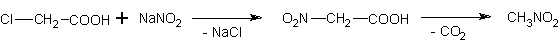 В большом стакане готовят раствор 1,05 моля хлоруксусной кислоты в 200 мл воды, нейтрализуют его содой и прибавляют .раствор 1 моля нитрита натрия в 120 мл воды. В приборе для перегонки (емкость перегонной колбы 500 мл) нагревают 100 мл этого раствора; нагревание можно производить с помощью газовой горелки через проволочную сетку; при этом отгоняется нитрометан. Реакция сопровождается выделением углекислого газа и воды. Через капельную воронку, укрепленную на отводе для термометра, можно добавлять остаток реакционного раствора к горячему раствору в перегонную колбу так, чтобы скорость реакции можно было хорошо контролировать. Перегонку продолжают до тех пор, пока в приемник поступают маслянистые капли, затем заменяют приемник и отгоняют еще 100 мл воды. Нитрометан отделяют из первой фракции, оба водных раствора объединяют, насыщают хлористым натрием и вновь отгоняют около четверти этого раствора. При этом получают еще некоторое количество нитрометана, который также отделяют. После высушивания хлористым кальцием нитрометан перегоняют еще раз.