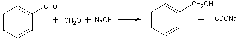 В двухгорлую колбу, снабженную мешалкой и обратным холодильником, помещают 19 мл бензальдегида, 50 мл воды и 40 мл формалина. При перемешивании добавляют 40 мл 40%-ного раствора гидроксида натрия, температура при этом повышается до 70 С. Затем реакционную смесь оставляют стоять в течение 10 ч. Постепенно жидкость разделяется на 2 слоя. Верхний слой (бензиловый спирт) отделяют в делительной воронке. Непрореагировавший бензальдегид удаляют с помощью гидросульфита натрия. Смесь взбалтывают с водой и после отстаивания водный слой отделяют от бензилового спирта. Последний сушат безводным сульфатом натрия и перегоняют собирая фракцию с т.кип. 204-206 С.