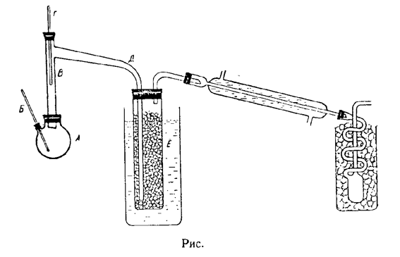 Аппарат для получения фурана показан на рисунке ниже. В круглодонную колбу А емкостью 200 мл через боковой тубус вставлен термометр Б, доходящий почти до дна колбы. Горло колбы А плотно закрыто резиновой пробкой, через которую проходит вертикальная трубка В длиной 15 см и диаметром 1,8-2,0 см. Верхнее отверстие трубки В закрывают резиновой пробкой, в которую вставлена длинная стеклянная палочка Г, служащая для сбрасывания в колбу возгоняющейся фуранкарбоновой кислоты. На расстоянии 2,5—3 см от верхнего конца к вертикальной трубке В припаян боковой отвод Д диаметром 1,8—2,0 см. Более узкая (диам.1 см) вертикальная часть отводной трубки Д оканчивается на дне колонки Е диаметром 3,5—4 см и высотой 25 см. Колонка Е заполнена кусками едкого натра величиной с горошину, отделенными от конца трубки Д слоем ваты (для поглощения углекислого газа и воды). Колонка Е погружена в водяную баню (высокий стакан), нагретую до 45—50°С. Отводная трубка колонки Е соединена с нисходящим холодильником, к которому присоединен приемник, находящийся в смеси льда и соли (в качестве приемника целесообразно использовать небольшой змеевиковый конденсатор).