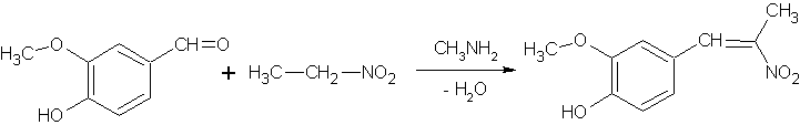 К раствору 6 г ванилина в 10 мл этанола прибавляют 3 мл нитроэтана, 0,2 г гидрохлорида метиламина и 0,016 г карбоната натрия. Реакционную смесь выдерживают в течение 48 ч в темноте при комнатной температуре, охлаждают до 0°С, выпавшие желтые кристаллы отфильтровывают, промывают разбавленной серной кислотой, водой и высушивают.