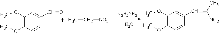 К 8 мл нитроэтана прибавляют 15 г вератрового альдегида, а затем 20 капель 75%-ного водного раствора этиламина. Образующаяся вначале муть постепенно исчезает и выделяющееся желтое масло со временем затвердевает. Через 8 суток выпавшие кристаллы отделяют, промывают и высушивают.