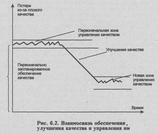 Система обеспечения качества должна действовать на всех стадиях петли качества, причем по характеру воздействия в системе могут быть установлены три направления: обеспечение качества, управление качеством, улучшение качества (рис. 6.2). Каждое из этих воздействий отличается характерным содержанием. Обеспечение качества продукции складывается из планирования и систематического осуществления мероприятий, которые должны создать такие условия для реализации каждого из этапов петли качества, чтобы качество продукции соответствовало заданным требованиям.