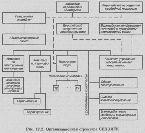 органы, а также участвуют представители ЕС и ЕАСТ. Генеральная ассамблея избирает Административный совет, состоящий из делегаций (до 5 человек) от национальных организаций стран-членов. Структуры, ответственные за стандартизацию (рис. 12.2), аналогичны описанным для СЕН. СЕНЭЛЕК с ними тесно сотрудничает.