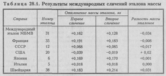 Отклонения массы эталонов, определяемые при международных сличениях, показывают достаточную степень ее стабильности. В табл. 28.1 приведены результаты двух сличений.