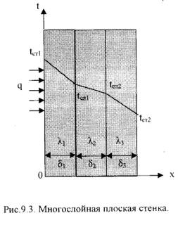 q = (t1 – t4)/(δ1/λ1 + δ2/λ2 + δ3/λ3) = (tст1 – tст4)/Ro , (9.21)