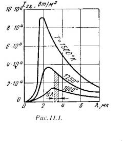 По мере увеличения длины волны энергия лучей возрастает, при некоторой длине волны достигает максимума, затем убывает. Кроме того, для луча одной и той же длины волны энергия его увеличивается с возрастанием температуры тела, испускающего лучи (рис.11.1).