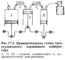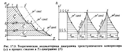 Рассмотрим в качестве примера работу трехступенчатого поршневого компрессора, схема которого приведена на рис.17.2, а рабочий процесс в pх- и тs- координатах (для идеального компрессора) — на рис.17.3.