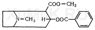 Кокаин является алкалоидом, который находится в листьях кока. Кроме кокаина (около 1 %) в этих листьях содержится ряд других алкалоидов (тропакокаин, циннамилкокаин, гигрин, кускгигрин и др.) и азотистых оснований. Из всех алкалоидов, находящихся в листьях кока, только кокаин применяется в медицине в виде гидрохлорида. По химическому строению кокаин представляет собой метиловый эфир бензоилэкгонина. Основание кокаина растворяется в хлороформе (1 : 0,5), диэтиловом эфире (1 : 4), этиловом спирте (1 : 7), плохо растворяется в воде (1 : 1300). Гидрохлорид кокаина растворяется в воде (1 : 0,5), этиловом спирте (1 : 4,5), хлороформе (1 : 18), почти не растворяется в диэтиловом эфире.