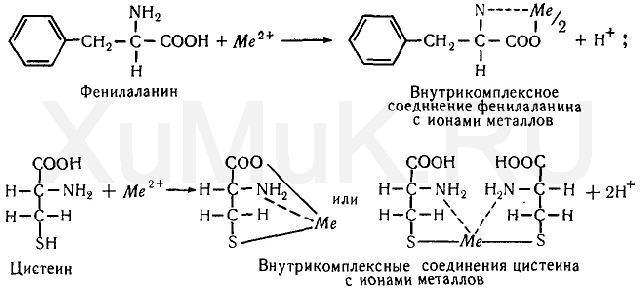 Катионы металлов также могут связываться с боковыми реакционноспособными функциональными группами (—SH,—NH 2, — СООН) аминокислот с образованием внутрикомплексных соединений. Из аминокислот большой способностью связывать металлы обладают гистидин, содержащий в молекуле имидазольное кольцо, и цистеин, в молекуле которого имеется сульфгидрильная группа.