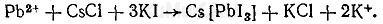 Реакция с хлоридом цезия и иодидом калия. На предметное стекло наносят 4—5 капель водной фазы, которую выпаривают на небольшом пламени. На сухой остаток наносят 2—3 капли 30%-го раствора уксусной кислоты. С одного края жидкости помещают 2—3 кристаллика хлорида цезия, а с противоположного — несколько кристалликов иодида калия. При наличии ионов свинца образуются желто-зеленые игольчатые кристаллы, собранные в виде сфероидов: