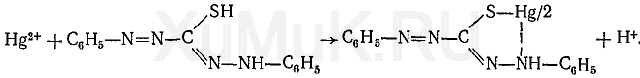 Реакция с дитизоном. Эта реакция основана на том, что при взаимодействии ионов ртути (II) с дитизоном образуется однозамещенный дитизонат этого металла: