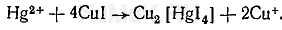 Реакция со взвесью иодида меди (I) основана на том, что при взаимодействии ионов ртути со взвесью иодида меди (I) образуется красный или оранжево-красный осадок Cu 2 [HgI 4 ]: