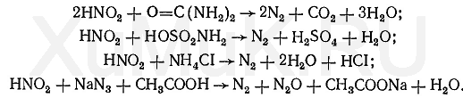 Для удаления азотистой кислоты из растворов предложено несколько способов, которые основаны на разложении этой кислоты мочевиной O = C(NH 2 ) 2, сульфаминовой (амидосульфоно-вой) кислотой HOSO 2 NH 2, солями аммония, азидом натрия NaN 3 и др. При всех этих реакциях происходит разложение азотистой кислоты с выделением азота: