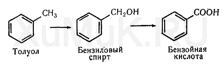 В алкильных производных бензола в первую очередь подвергается окислению алкильная группа. Так, толуол (метилбензол) окисляется до бензилового спирта, при дальнейшем окислении которого образуется бензойная кислота, выделяющаяся из организма в виде конъюгатов:
