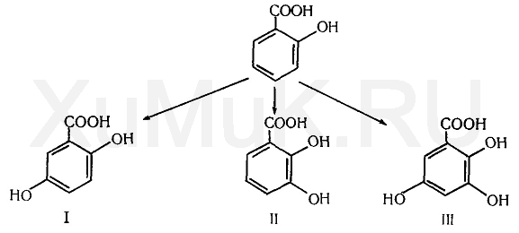 Поступившая в организм салициловая кислота может выделяться из него в неизмененном виде и в виде глюкуронида. Однако часть салициловой кислоты под влиянием ферментов печени метаболизируется с образованием гентизиновой (I), диоксибензойной (II) и триоксибензойной (III) кислот: