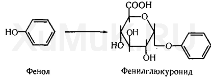 При образовании глюкуронидов переносчиком (кофермен-том) остатка глюкуроновой кислоты является УДФ-глюкуроно-вая кислота. Процесс образования глюкуронидов происходит при помощи фермента глюкуронилтрансферазы. Под влиянием указанного фермента глюкуроновая кислота с фенолами и спиртами образует О-глюкурониды: