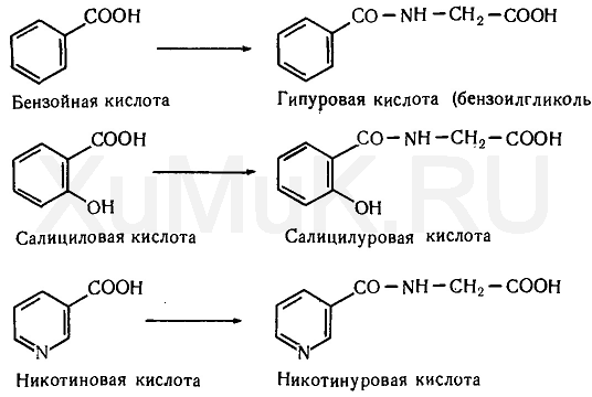 Конъюгация с глицином. Ароматические карбоновые кислоты, замещенные бензойной кислоты и гетероциклические карбоновые кислоты с глицином (гликоколем) H 2 N — СН 2 СООН и другими α-аминокислотами, образуют конъюгаты. Глициновые конъюгаты бензойной, салициловой, никотиновой и других кислот встречаются под названием гипуровые кислоты. Ниже приведены продукты конъюгации карбоновых кислот с глицином: