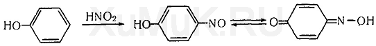 Реакция Либермана. Эта реакция также основана на образовании индофенола. В качестве реактивов на фенолы применяют нитрит натрия и серную кислоту. При взаимодействии нитрита натрия и серной кислоты образуется азотистая кислота, которая с фенолом образует n -нитрозофенол, при изомеризации которого образуется n -хиноидоксим: