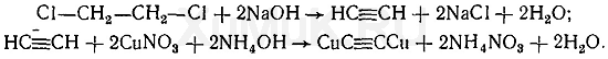 При нагревании 1,2-дихлорэтана в запаянной ампуле с раствором гидроксида натрия образуется ацетилен, который при взаимодействии с солями меди (I) дает ацетиленид меди (ацетиленистую медь), имеющий розовую или вишнево-красную окраску: