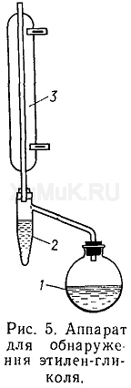К 10 г печени или содержимого желудка прибавляют 5 г кристаллической щавелевой кислоты, смесь растирают до получения тонкой кашицы, переносят в круглодонную колбу 1 вместимостью 100 мл и прибавляют 50 мл бензола. Колбу закрывают вертикально поставленным холодильником 3, снабженным приспособлением 2 для улавливания воды. Затем колбу устанавливают на водяную баню и нагревают. Пары бензола и увлекаемые им вода и этиленгликоль конденсируются в холодильнике и попадают в специальное приспособление. Поскольку в этом приспособлении (насадке) бензол (плотностью 0,879) находится сверху воды, он стекает в колбу. Вода и находящийся в ней этиленгликоль остаются в насадке. После окончания отгонки разбирают прибор и пипеткой из насадки отбирают необходимое для анализа количество жидкости.