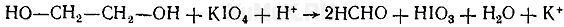 Для обнаружения этиленгликоля применяют цветные и микрокристаллоскопические реакции. Реакция окисления этиленгликоля периодатом и обнаружение образовавшегося формальдегида. Эта реакция основана на окислении этиленгликоля периодатом натрия или калия. В результате указанной реакции образуется формальдегид, который можно обнаружить при помощи фуксинсернистой кислоты: