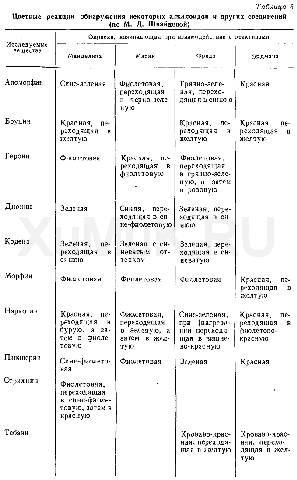 Цветные реакции. Для обнаружения алкалоидов в основном используются цветные реакции. Химизм большинства этих реакций не изучен. Реактивы, применяемые для обнаружения алкалоидов при помощи цветных реакций, относятся к различным классам химических соединений. Для этой цели применяются концентрированные серная и азотная кислоты, а также смеси концентрированной серной кислоты с другими соединениями. Значительную группу реактивов, применяемых для обнаружения алкалоидов, составляют органические вещества.