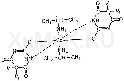 Реакция барбитуратов с изопропиламином и солями кобальта. Для обнаружения барбитуратов Парри (1924) предложил реакцию, основанную на взаимодействии этих веществ с солями кобальта и аммиаком. Позднее другие исследователи аммиак заменили изопропиламином. При взаимодействии барбитуратов с изопропиламином и солями кобальта образуются внутриком-плексные соединения: