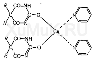 При взаимодействии комплекса пиридина с ионами меди и ионизированными молекулами барбитуратов образуется внутрикомплексное соединение: