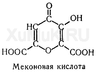 При длительном кипячении растворов меконовой кислоты она разлага ется на оксид углерода (IV) и коменовую кислоту, которая при дальнейшем нагревании превращается в β-оксипирон, обладающий свойствами фенолов.