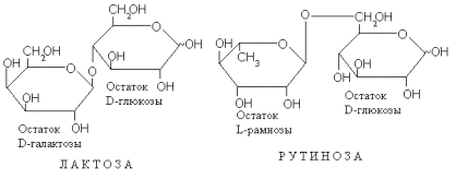 Моносахариды – полифункциональные соединения. Многие их реакции обусловлены, как мы видели, преимущественно карбонильной группой. В других же они выступают прежде всего как спирты. В качестве спиртов они могут служить агликонной составляющей гликозидов. Так, возникают дисахариды, в которых два моносахаридных остатка соединенных гликозидной связью, причем один из них является гликозильным остатком, а другой – агликоном. Так, например, в молочном сахаре – лактозе – остаток D-галактозы составляет гликозильную часть молекулы, а остаток D-глюкозы служит агликоном. В другом дисахариде – рутинозе – роль гликозильного остатка и агликона выполняют соответственно остатки L-рамнозы и D-глюкозы (см. с. 23).