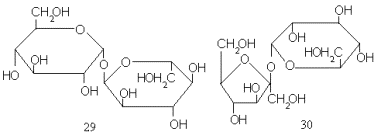 А эти остатки, как мы видим, могут иметь четыре различные структуры для каждого моносахарида. Но и это еще не исчерпывает разнообразия дисахаридных структур, так как и полуацетальный гидроксил может служить местом присоединения гликозильного остатка. Примером таких дисахаридов – их называют невосстанавливающими, так как в отличие от остальных дисахаридов и от моносахаридов, они не восстанавливают реагенты типа фелинговой жидкости или аммиачного раствора окиси серебра – может служить трегалоза (29). В таком дисахариде любой из двух моносахаридных остатков можно произвольно считать либо гликозильным, либо агликоном. Другой пример невосстанавливающего дисахарида – сахароза (или тростниковый сахар) (30), построенная из остатков D-глюкозы и D-фруктозы.
