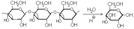 В химии полимеров мономерным анализом называют выяснение вопроса о том, из каких мономерных остатков построен изучаемый полимер. В химии полисахаридов мономерный анализ должен прежде всего установить, из каких моносахаридов построен полисахарид. Для этого нужно расщепить его до моносахаридов, т.е. разорвать все гликозидные связи. Важнейшая реакция, с помощью которой такой результат может быть достигнут,- это кислотный гидролиз гликозидных связей, представленный на примере гидролиза фрагмента b -1 à 3-связанного D-глюкана.
