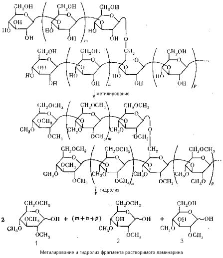 Метилирование полисахарида приводит к образованию его полного метилового эфира, не содержащего свободных гидроксильных групп. Последующий гидролиз дает смесь частично метилированных глюкоз (1-3).