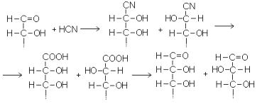 1. Циангидриновый синтез, т.е. присоединение к альдозам синильной кислоты с последующим гидролизом нитрильной группы и восстановлением карбоксильной до альдегидной. Результатом этой реакции является удлинение углеродной цепи альдозы на одно звено и возникновение нового ассиметрического центра, вследствие чего из каждого моносахарида получается не один, а два новых моносахарида – стереоизомеров по C-2. В общем виде эта последовательность показана на схеме: