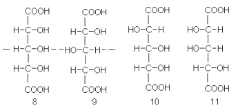 После окисления арабинозы азотной кислотой Фишер получил оптически деятельную, следовательно ассиметричную дикарбоновую кислоту. Это сразу исключало две структуры из четырех возможных. В самом деле, ожидаемые продукты из четырех возможных пентоз следующие (8-11):