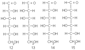 Путем циангидринного синтеза из арабинозы были получены две гексозы: глюкоза и манноза. Из этого следовало, что у последних конфигурация центров при C-3, C-4 и C-5 такая же, как в арабинозе (у ее C-2, C-3 и C-4 соответственно), и что различия между глюкозой и маннозой сводятся только к различию конфигурации C-2. Таким образом, глюкозе и маннозе могут соответствовать либо пара конфигураций 12 и 13 (если арабиноза- это 6), либо пара 14 и 15 (если арабиноза – это 7).