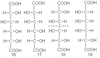 Для выбора между этими парами Фишер опять применил принцип уравнивания концов. Четырем гексозам 12-15 соответствуют четыре дикарбоновые кислоты (16-19):