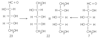 В обоих примерах для перехода от альдоз к полиолам использовано восстановление боргидридом натрия. Видно, что в обоих случаях, при всем внешнем несходстве, применена стереохимическая логика, заимствованная из работы Фишера.