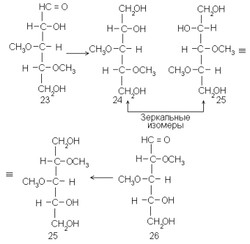 Логический приемы, введенные Фишером, широко используются в структурных исследованиях до сих пор (правда, на иной химической основе). Приведем здесь только два примера, в основу которых положено уравнивание концов: сведение D-арабинозы (21) и D-ликсозы (7) к одному и тому же полиолу (22), и идентификацию 3,4-ди-О-метил-D-ксилозы (23), для которой заведомый образец труднодоступен, в виде полиола 24 с его оптическим антиподом 25, который образуется из более доступной 2,3-ди-О-метил-D-ксилозы (26):