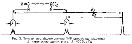 В обычном спектре ПМР каждый имеющийся в молекуле протон дает свой сигнал (другое дело, что сигналы двух или более протонов могут накладываться друг на друга). Этот сигнал характеризуется тремя параметрами: интенсивностью, которая прямо пропорциональна содержанию протонов данного типа в образце, величиной химического сдвига, измеряемого от некоторого внутреннего стандарта (чаще всего тетраметилсилана) в единицах м.д. (т.е. в миллионных долях рабочего поля прибора), и величиной константы спин-спинового взаимодействия с другим (или другими) протонами в той же молекуле. Эта константа, проявляющаяся в спектре в виде расщепления сигналов на отдельные компоненты и сокращенно называется обычно КССВ, измеряется в герцах (рис. 3).