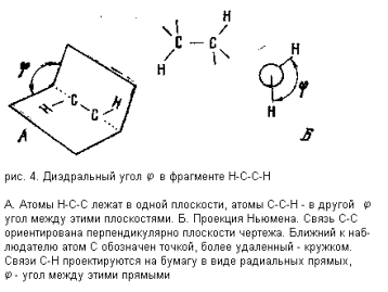 Если (в первом приближении) считать длины связей и углы H-C-C и C-C-H постоянными величинами, то геометрия фрагмента H-C-C-H может быть описана одним параметром: так называемым диэдральным, или двугранным, углом j , смысл которого виден из рис. 4.