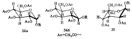 Внимательный анализ рассмотренного примера показывает, что здесь спектроскопия ПМР позволяет одновременно решить вопрос и о конформации изучаемого соединения, и о конфигурации ассиметрического центра. Точнее говоря, вопрос о конфигурации спектроскопией ПМР в данном случае не решается: она определяется лишь опосредованно, через конформацию. В самом деле, глюкозиду 34б можно, по крайней мере, формально, приписать конформацию 35. В этом случае диэдральный угол фрагмента H-C-C-H составлял бы уже не 180 ° , а около 60 ° , ожидаемая КССВ была бы существенно иной, а выводы из спектра ПМР могли бы оказаться прямо ошибочными. Однако из общих принципов конформационного анализа мы можем заключить, что для β -глюкозида конформация 35, если и реализуется, то в достаточно малой пропорции по сравнению с конформацией 34б. Так что сделанное выше заключение остается в силе.