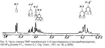 Для иллюстрации приведем здесь спектр тетрабензоата α -D-ликсопиранозы (рис. 5) и его трактовку. При этом мы упростим свою задачу: не будем расшифровывать шаг за шагом спектр, полученный с прибора, а попытаемся разобраться, и то лишь в общих чертах, почему сигналы определенных протонов расположились в спектре именно таким образом (будем рассматривать только наиболее информативную часть спектра – протоны пиранозного цикла).
